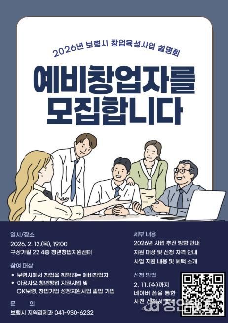 정안뉴스 황도연 기자 | 보령시는 오는 2월 12일 오후 7시 청년창업지원센터에서 예비창업자 및 창업기업을 대상으로 ‘2026년 창업육성사업 설명회’를 개최한다.