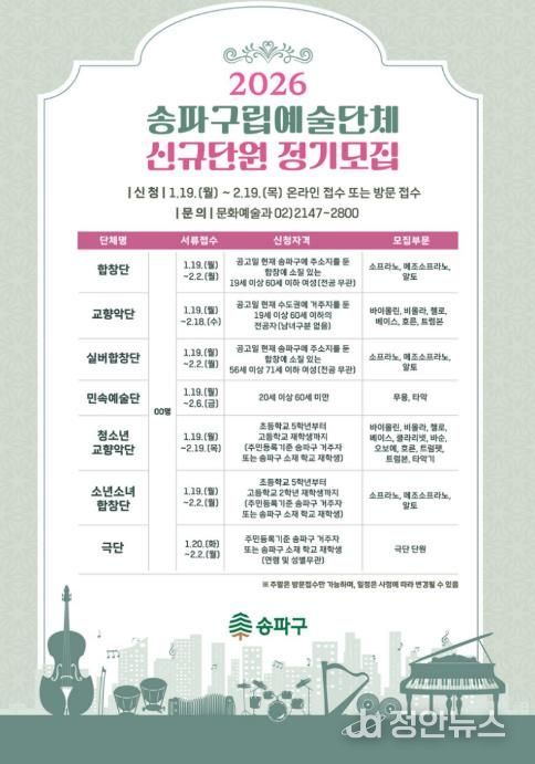 정안뉴스 안정주 기자 | 서울 송파구는 지역 문화예술 저변 확대와 구민의 문화 향유 기회 제공을 위해 오는 2월 19일까지 구립문화예술단체 신규단원을 공개 모집한다고 밝혔다.