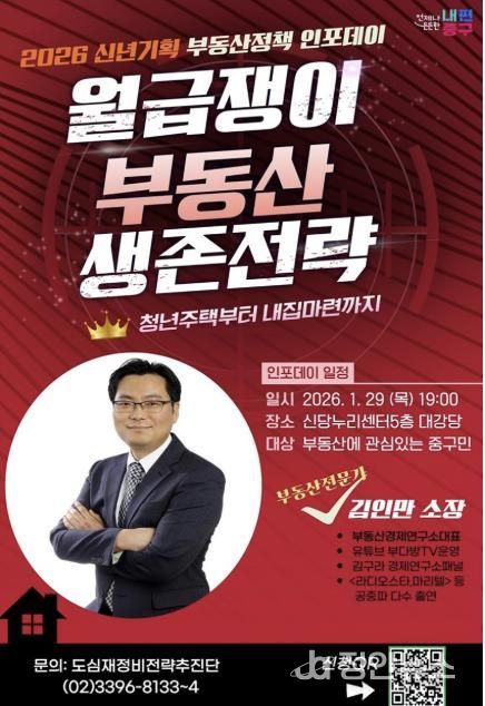 정안뉴스 안정주 기자 | 서울 중구가 급변하는 부동산 환경 속에서 주민들의 현실적인 대응 전략을 돕기 위해 오는 29일 저녁 7시 신당누리센터 5층 대강당에서 올해 첫 도시런(learn) 스쿨‘신년기획 부동산 전략 인포(INFO)데이’를 연다.