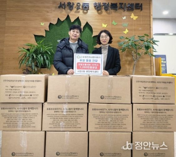 정안뉴스 안정주 기자 | 인천시 남동구 서창2동 행정복지센터는 (사)수와진의 사랑더하기로부터 어려운 이웃을 위한 겨울 선물세트 50상자를 기부받았다고 19일 밝혔다.