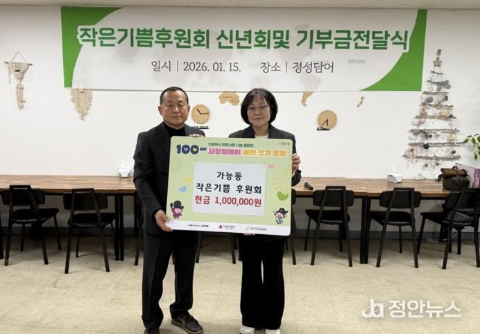 정안뉴스 안정주 기자 | 의정부시 가능동주민센터는 1월 15일 작은기쁨후원회가 ‘100일간 사랑릴레이 배턴 잇기’에 동참하며 성금 100만 원을 기탁했다고 밝혔다.