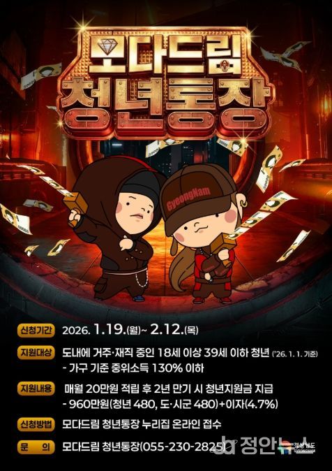 정안뉴스 김재홍 기자 | 경상남도와 경남투자경제진흥원은 청년의 자산 형성과 지역 정착을 돕는 ‘모다드림 청년통장’ 상반기 참여자를 1월 19일부터 2월 12일까지 모집한다고 밝혔다.