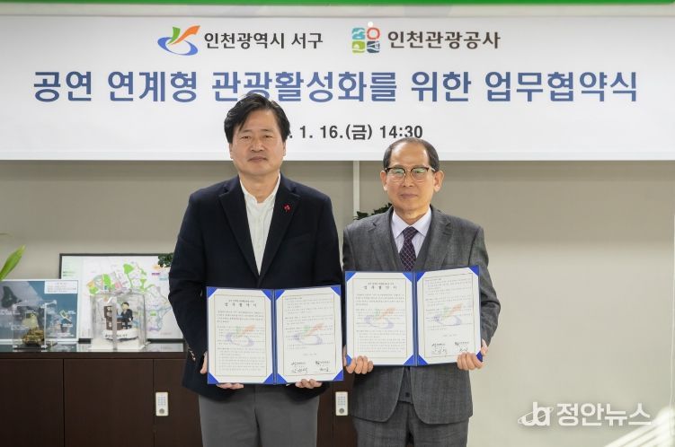 정안뉴스 안정주 기자 | 인천 서구는 지난 16일 인천관광공사(사장 유지상)와 ‘공연 연계형 관광 활성화를 위한 업무협약’을 체결했다고 밝혔다.