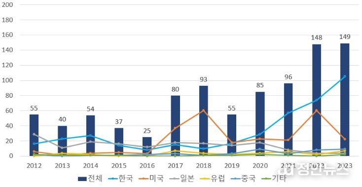 특히, 최근 3년 기준(2021~2023년) 삼성전자(139건)·SK하이닉스(86건)가 1위와 2위를 차지하여 한국이 전 세계 AI 메모리용 강유전체 소자의 연구개발을 주도하고 있음을 확인할 수 있었다.