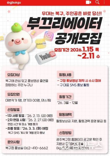 정안뉴스 안정주 기자 | 광주광역시 북구는 주민이 직접 북구의 소식을 전하는 ‘부끄리에이터’를 모집한다고 19일 밝혔다.