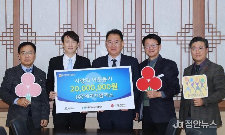 정안뉴스 안정주 기자 | ㈜에이치알에스는 지난 15일 평택시청 대외협력실에서 평택행복나눔본부에 이웃돕기 성금 2천만 원을 전달했다.