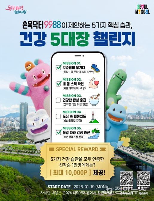 서울시는 새해를 맞아 시민들이 건강한 생활 습관을 자연스럽게 실천할 수 있도록 손목닥터9988 앱을 활용한 ‘건강 5대장 인증 챌린지’ 운영에 나섰다.