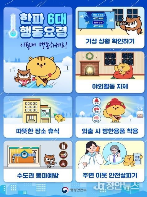 정안뉴스 안정주 기자 | 행정안전부는 1월 20일부터 25일까지 전국 대부분 지역에 한파가 이어질 것으로 전망됨에 따라 김광용 재난안전관리본부장 주재로 관계기관 대책회의를 개최하고, 오늘(19일) 17시부로 한파 재난 위기경보 수준을 ‘관심’에서 ‘주의’ 단계로 격상한다고 밝혔다.