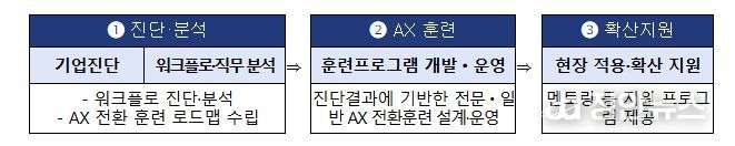 ① 1단계(진단·분석): 전문가가 기업 현장을 방문해 AI도입 준비 수준을 진단하고, 업무 프로세스별 병목 구간을 파악해 ‘AI 훈련 로드맵’을 수립한다.