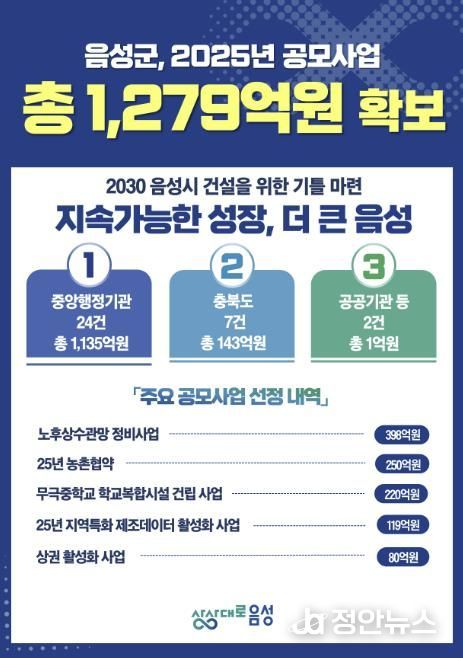 군 관계자는 “공모사업은 음성군의 당면 현안을 해결하고 미래 먹거리를 창출하는 중요한 발판”이라고 강조하며 “앞으로도 확보된 사업들이 군정 발전을 견인하는 핵심 동력이 될 수 있도록 최선을 다하겠다”고 밝혔다.