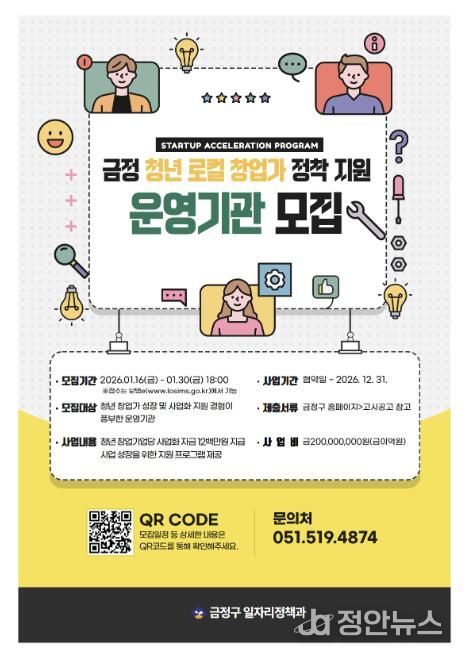 정안뉴스 황정혜 기자 | 부산 금정구는 지역에 정착할 수 있는 청년 로컬 창업가를 육성하기 위해 ‘금정 청년 로컬 창업가 정착 지원’ 사업을 추진하고, 이를 운영할 운영기관(보조사업자)을 공개 모집한다고 밝혔다.
