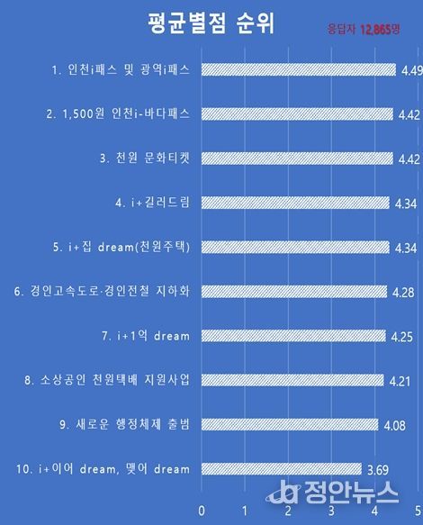 이어 실생활 밀착형 정책인 천원정책이 높은 평가를 받았으며, ▲1,500원으로 인천 전 섬을 이용할 수 있는 ‘아이(i) 바다패스’(4.42점) ▲1,000원으로 문화생활을 즐길 수 있는 ‘천원 문화티켓’(4.42점) ▲1일 임대료 1,000원의 ‘천원주택’(4.34점) ▲소상공인 택배비 1,000원을 지원하는 ‘천원택배 지원사업’(4.21점) 순으로 나타났다.