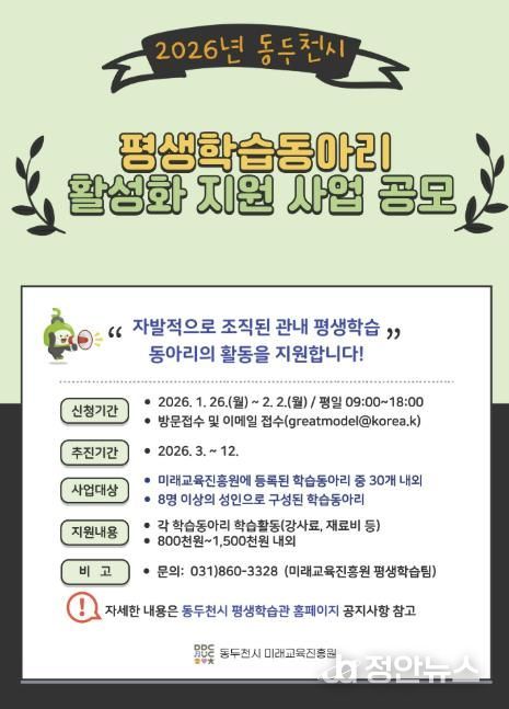 정안뉴스 안정주 기자 | 동두천시는 오는 1월 26일부터 2월 2일까지, 시민 주도형 평생학습 문화 확산을 위해 ‘2026년 평생학습 동아리 활성화 지원사업’에 참여할 학습동아리를 모집한다고 밝혔다.