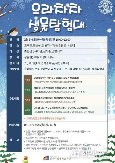 정안뉴스 안정주 기자 | 칠보생태환경체험교육관이 겨울방학 프로그램 ‘으라차차 생물탐험대(겨울 탐조프로젝트)’에 참여할 초등학교 1~4학년 어린이 15명을 선착순으로 모집한다.