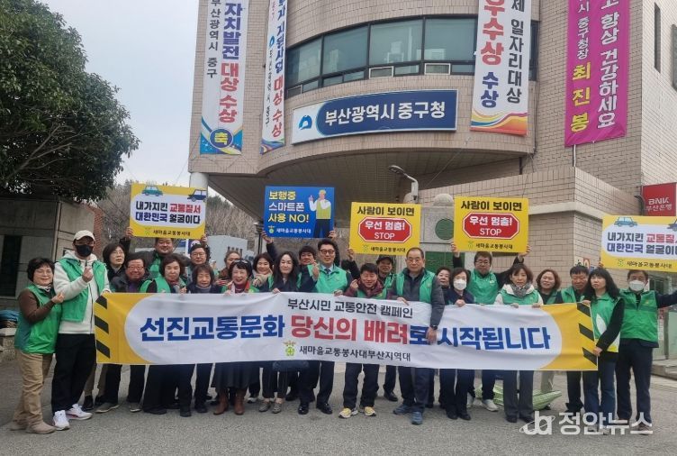 정안뉴스 황정혜 기자 | 부산광역시중구새마을회(회장 이형목)는 지난 19일 중구청 앞에서 ‘부산시민 교통안전 캠페인’을 펼쳤다. 회원들은 현수막과 피켓을 이용해 시민들에게 교통법규 준수의 중요성을 알리고, 안전한 보행환경 조성에 적극 동참해 줄 것을 당부했다.
