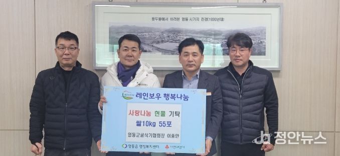 서우종 영동읍장은 “평소 지역발전을 위해 적극 협조해 주시는 데 이어 따뜻한 나눔까지 실천해 주셔 감사드린다”며 “기탁해 주신 쌀은 필요한 가정에 정성껏 전달하겠다”고 말했다.