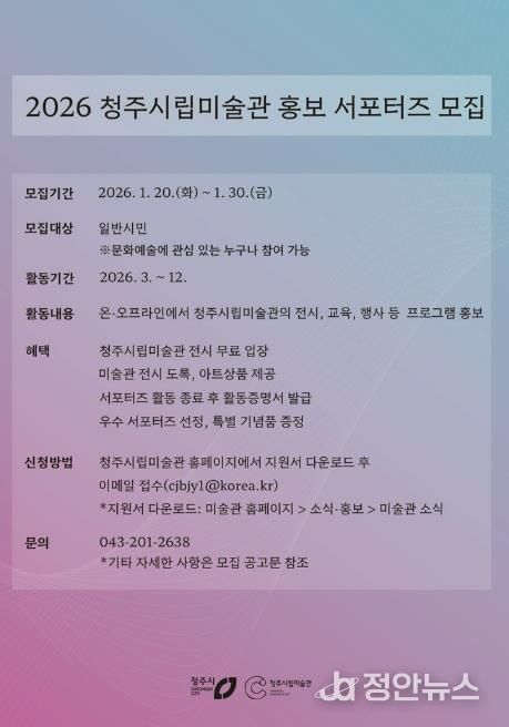 정안뉴스 황은경 기자 | 청주시립미술관은 미술관의 전시와 교육 프로그램을 시민의 시선으로 소개할 ‘2026 청주시립미술관 홍보 서포터즈’를 오는 30일까지 모집한다고 밝혔다.