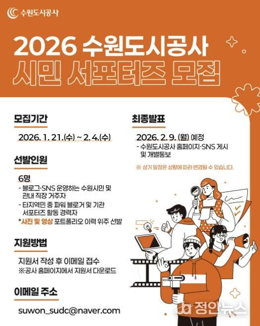 정안뉴스 안정주 기자 | 수원도시공사가 21일부터 다음 달 4일까지 2026년도 제8기 시민 서포터즈를 모집한다.