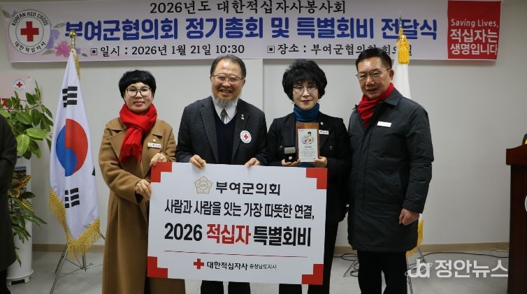 정안뉴스 황도연 기자 | 부여군의회는 21일 대한적십자사봉사회 부여군협의회 정기총회에서 2026년도 대한적십자사 특별회비 전달식을 가졌다.