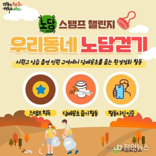 정안뉴스 황은경 기자 | 청주시 서원보건소는 매주 토요일과 일요일에 깨끗한 금연환경 조성을 위한 비대면 자원봉사 프로그램 ‘우리 동네 노담걷기’를 연중 운영한다고 22일 밝혔다.