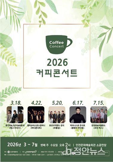 정안뉴스 안정주 기자 | 인천문화예술회관(관장 홍순미)이 간판 브랜드 공연 〈커피콘서트'의 2026년 상반기 출연진을 공개한다.