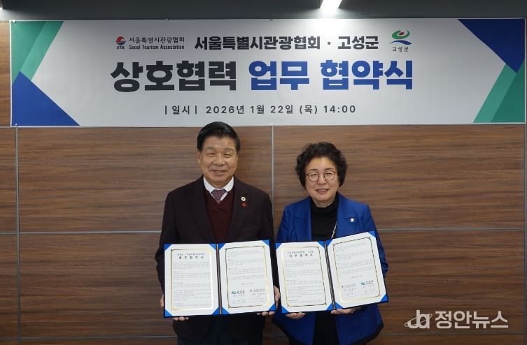 정안뉴스 김재홍 기자 | 경남 고성군은 1월 22일 서울특별시관광협회 회의실에서 서울특별시관광협회(회장 조태숙)와 지역 관광 활성화 및 관광산업 발전을 위한 업무협약(MOU)을 체결했다고 밝혔다.