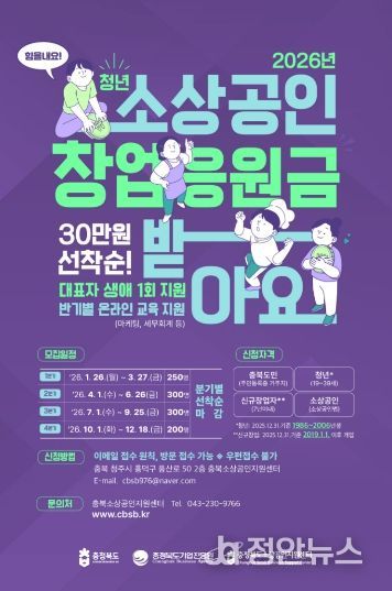 정안뉴스 황은경 기자 | 충북도와 (재)충청북도기업진흥원(소상공인지원센터)이 ‘2026년 청년 소상공인 창업응원금 지원사업’의 1분기 참여자 250명을 1월 26일부터 오는 3월 27일까지 선착순으로 모집한다.