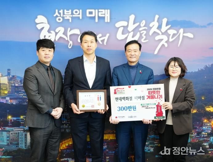 정안뉴스 안정주 기자 | 서울 성북구가 지난 21일 현대백화점 미아점으로부터 취약계층의 겨울나기 지원을 위한 성금 300만 원을 기탁받았다.