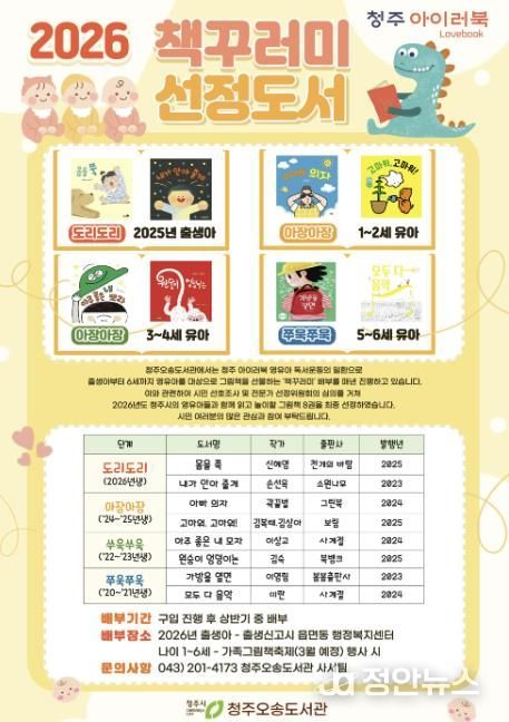정안뉴스 황은경 기자 | 청주오송도서관은 청주시 영유아 독서운동 ‘청주 아이러북(LoveBook)’ 사업의 일환으로 2026년 영유아에게 선물할 대표도서 8권을 최종 선정했다고 26일 밝혔다.