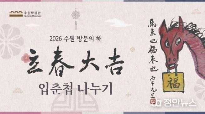정안뉴스 안정주 기자 | 수원박물관이 2026 수원 방문의 해를 맞아 1월 31일 오후 1시부터 3시까지 박물관 1층 로비에서 세시(歲時) 행사 ‘입춘첩 나누기’를 연다. 관람객에게 서예가 근당 양택동 선생의 친필 입춘첩을 배부한다.