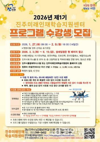 정안뉴스 김재홍 기자 | 진주시는 4차 산업혁명 시대를 선도할 미래인재를 양성하기 위해 진주시에 거주하는 유아와 초·중·고교생, 학부모를 대상으로 ‘2026년 제1기 진주미래인재학습지원센터 프로그램’ 수강생을 모집한다고 밝혔다.