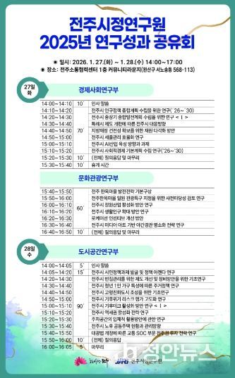 정안뉴스 안정주 기자 | 전주시정연구원(원장 박미자)은 개원 2주년을 맞아 27, 28일 양일간 전주시 주요 정책 연구성과를 공유하는 ‘2025년 연구성과 공유회’를 개최한다고 26일 밝혔다.