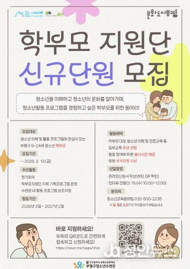 정안뉴스 안정주 기자 | 부평구 청소년수련관은 오는 3월 13일까지 2026년 제7기 학부모지원단 ‘데이트’의 신규 단원을 모집한다고 밝혔다.