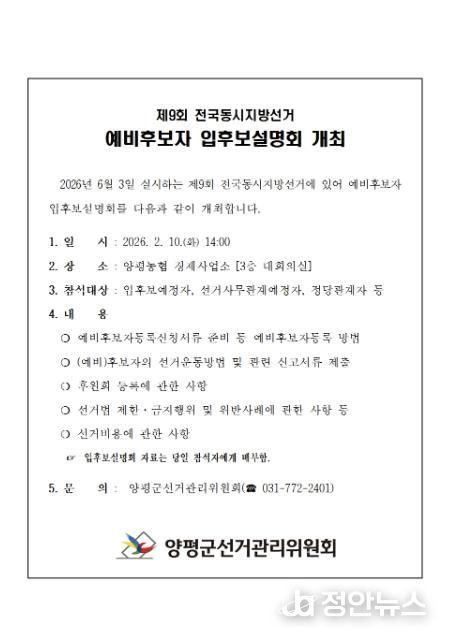 정안뉴스 안정주 기자 | 양평군선거관리위원회는 2월 10일 14:00 양평농협 경제사업소 3층 대회의실에서 2026. 6. 3. 실시하는 제9회 전국동시지방선거와 관련하여 입후보예정자들에게 (예비)후보자등록 및 선거운동방법 등에 관한'예비후보자 입후보설명회'를 개최한다고 밝혔다.