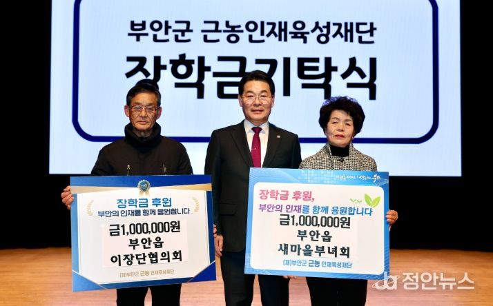 정안뉴스 안정주 기자 | 부안군은 지난 26일 부안예술회관 공연장에서 열린 부안읍 2026년 결실창래 군민과의 희망소통대화 행사에서 부안읍 이장단협의회와 부안읍 새마을부녀회가 부안군 근농인재육성장학금 100만원씩을 각각 기탁했다고 밝혔다.