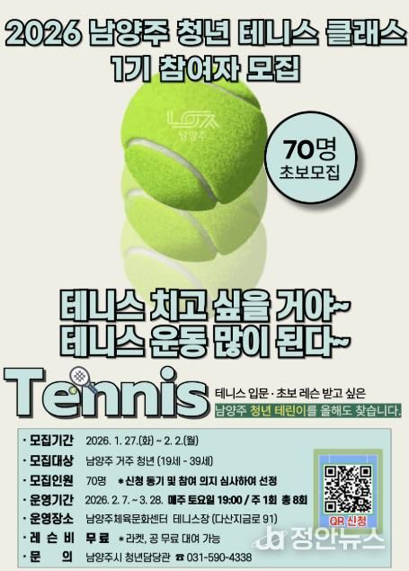 정안뉴스 안정주 기자 | 남양주시는 27일부터 내달 2일까지 ‘2026 남양주 청년 테니스 클래스 1기’ 참여자를 모집한다고 밝혔다.