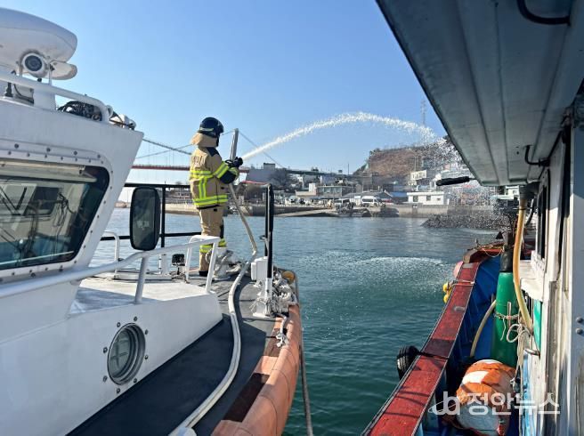 정안뉴스 김재홍 기자 | 사천해양경찰서는 오늘(27일) 오후 2시 하동군 구노량항에서 밀집 계류지 어선 화재 사고를 가정한 합동훈련을 실시했다고 밝혔다.