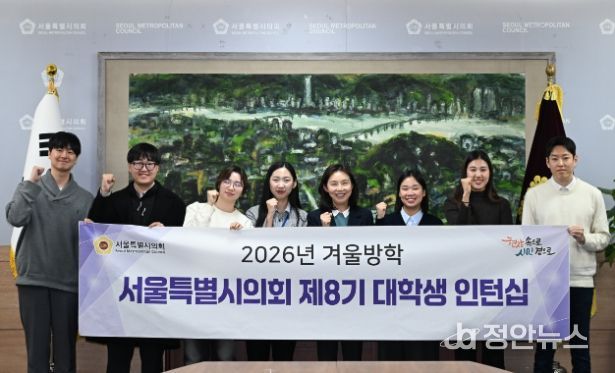 정안뉴스 안정주 기자 | 서울특별시의회 최호정 의장(국민의힘, 서초4)은 26일 의회 본관 의장접견실에서'제8기 겨울방학 대학생 인턴 간담회'를 개최하고, 청년들과 서울시 정책 현안, 일·가정 양립 고민 등을 주제로 진솔한 대화를 나눴다. 이번 간담회에는 대학생 인턴 7명이 참가했으며, 각자가 수행 중인 정책 연구 주제와 활동 소감을 공유했다.