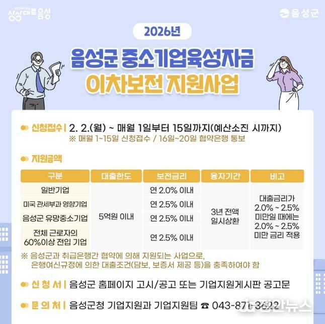정안뉴스 황은경 기자 | 음성군은 저금리 정책자금 지원을 통해 관내 중소기업의 유동성 확보를 도모하고, 고금리 장기화에 따른 기업의 금융비용 부담을 완화하기 위해 2026년 음성군 중소기업육성자금 이차보전 지원사업을 오는 2월부터 본격 추진한다.