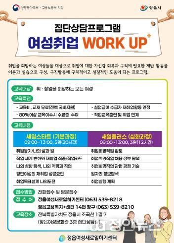 정안뉴스 안정주 기자 | 정읍시가 운영하는 정읍여성새로일하기센터가 취업을 희망하는 여성들의 구직 기술을 높이고 성공적인 재취업을 돕기 위해 ‘2026년 집단상담프로그램’ 참여자를 모집한다.