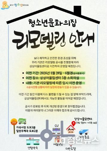 손순미 여성가족과장은 “이번 리모델링은 청소년들의 성장과 참여를 지원하는 공간으로 만들기 위한 필수적인 과정이며 공사 기간에도 프로그램 이용에 차질이 없도록 최선을 다할 것”이라며, “더 멋진 모습으로 재탄생할 청소년문화의집을 기대해 달라”고 전했다.