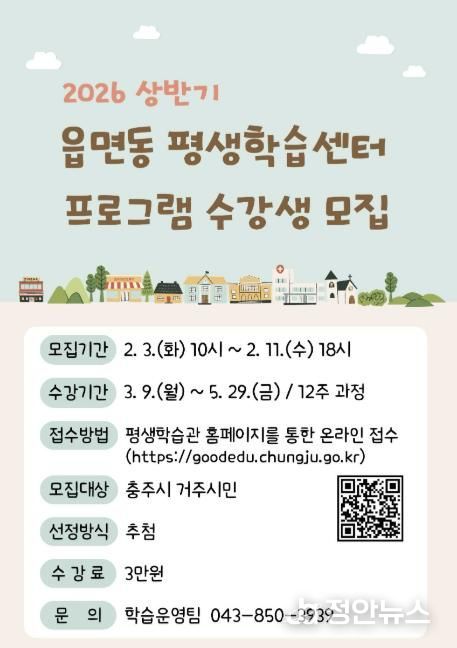 정안뉴스 황은경 기자 | 충주시 평생학습관은 시민 누구나 거주지 인근에서 배움의 기회를 누릴 수 있도록 2026년 상반기 읍면동 평생학습센터 프로그램 수강생을 모집한다고 30일 밝혔다.