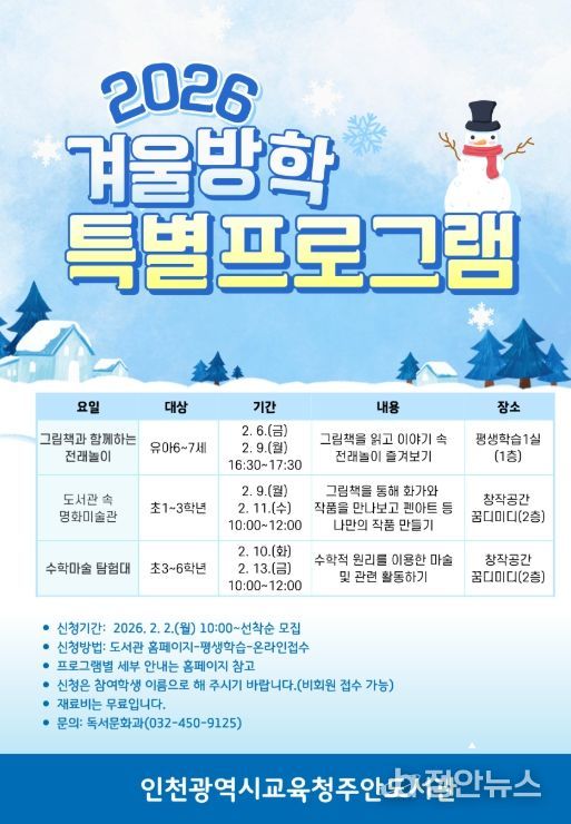 정안뉴스 안정주 기자 | 인천광역시교육청주안도서관은 관내 유·초등학생에게 다양한 평생학습 기회를 제공하기 위해 2월 6일부터 13일까지 ‘겨울방학 특별프로그램’을 운영한다.