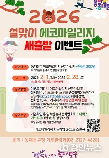 정안뉴스 안정주 기자 | 동대문구가 '설맞이 에코마일리지 새출발 이벤트'를 2월 1일부터 2월 28일까지 한 달간 운영한다. 설 명절을 맞아 구민의 에너지 절약 실천을 확산하고 에코마일리지 참여를 활성화하기 위함이다.