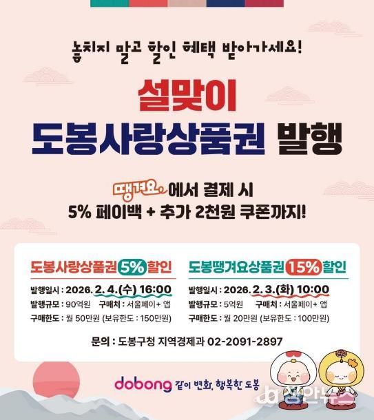 정안뉴스 안정주 기자 | 서울 도봉구가 민족 대명절 설을 맞아 90억 원 규모의 도봉사랑상품권과 5억 원 규모의 도봉땡겨요상품권을 발행한다.