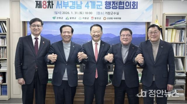 정안뉴스 김재홍 기자 | 거창군은 지난 31일 거창군청에서 신성범 국회의원과 산청ᐧ함양ᐧ거창ᐧ합천군 군수가 참석해 ‘서부경남 4개군 제8차 행정협의회'를 개최했다.