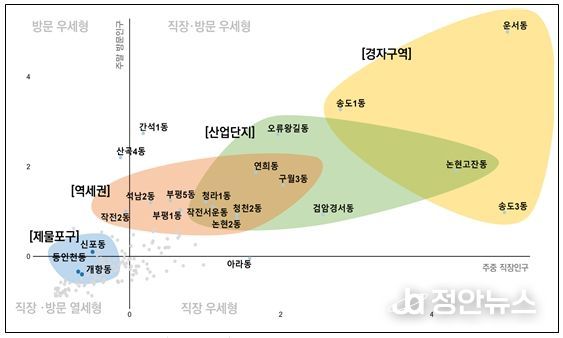 직장·방문인구 모두 많은 지역은 송도(4개 동), 영종(운서동), 청라(3개 동)와 부평(6개 동), 구월(5개 동), 주안(2개 동)으로 나타났는데, 공통적으로 교통접근성이 우수하고, 상업·업무·산업기능이 집적된 지역에 집중되는 경향을 보인다.