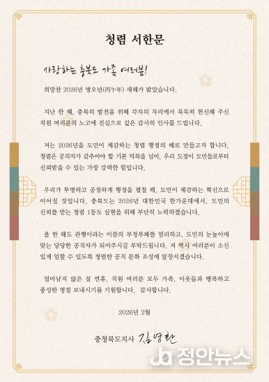 정안뉴스 황은경 기자 | 김영환 충북도지사가 2026년 병오년(丙午年)을 ‘도민이 체감하는 청렴 행정의 해’로 만들겠다는 의지를 담은 청렴서한문을 전 직원에게 발송하고, 올 한 해 청렴 실천을 당부했다.