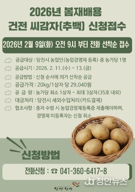 정안뉴스 황도연 기자 | 당진시는 봄 재배용으로 활용될 조직배양 ‘추백’ 씨감자 원종 2톤을 관내 농가에 공급하기 위해 오는 9일 오전 9시부터 선착순으로 신청을 받는다고 3일 밝혔다.