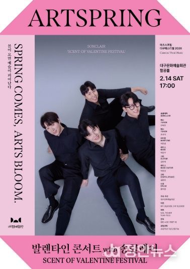 정안뉴스 안정주 기자 | 대구문화예술진흥원 대구문화예술회관은 오는 2월 14일 오후 5시, 팔공홀에서 지역 성악가로 구성된 남성 4인조 크로스오버 보컬 그룹 송클레어(SONCLAIR)와 함께하는 ‘발렌타인 콘서트 with 송클레어 – Scent of Valentine Festival’을 개최한다.